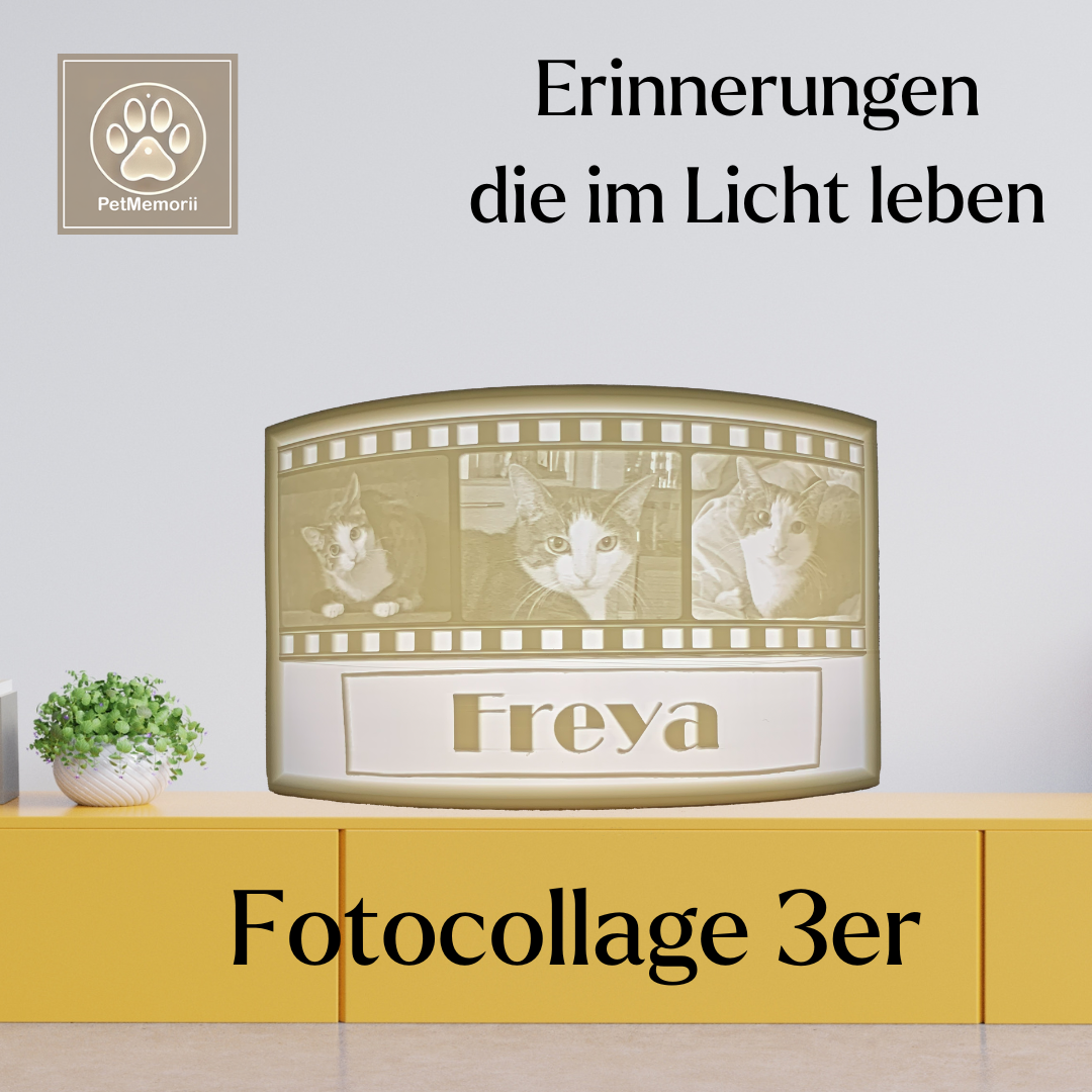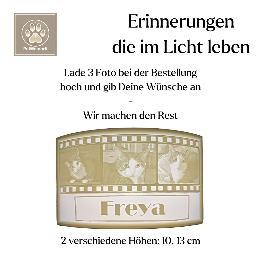 Erwecke die schönsten Erinnerungen mit deinem Haustier zum Leben! Dieses einzigartige Lithophan-Bild kombiniert deine drei liebsten Fotos auf einem stilvollen Filmstreifen und lässt sie im Licht erstrahlen. Darunter prangt der Name deines treuen Begleiters – eine persönliche Hommage an die besonderen Momente, die euch verbinden.